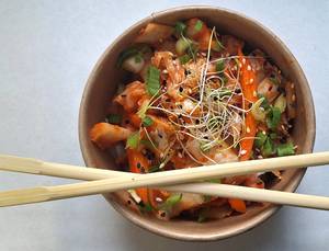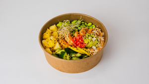 Bowl z ryżem, kurczakiem lub tofu w sosie teriyaki, marchewką piklowaną, kapustą, goma-wakame, kiełkami mung, jajkiem nitamago, ogórkiem, dymką i sezamem.
