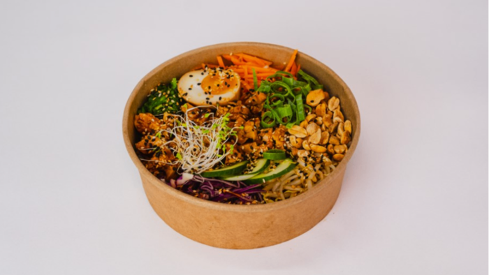 Bowl z ryżem, kurczakiem lub tofu w sosie teriyaki, marchewką piklowaną, kapustą, goma-wakame, kiełkami mung, jajkiem nitamago, ogórkiem, dymką i sezamem.
